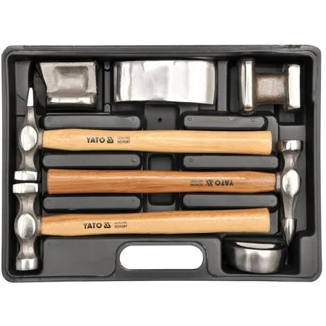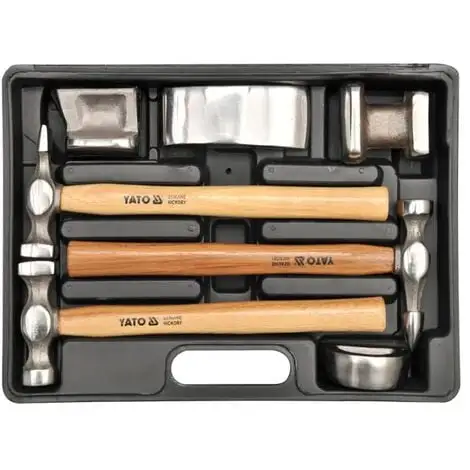 L’ensemble pour les ailes d’automobile est un kit pratique et efficace pour fabriquer des tôles d’acier. Les surfaces de travail des marteaux et des enclumes adaptés avec précision permettent d’obtenir différents plans de la tôle profilée.
