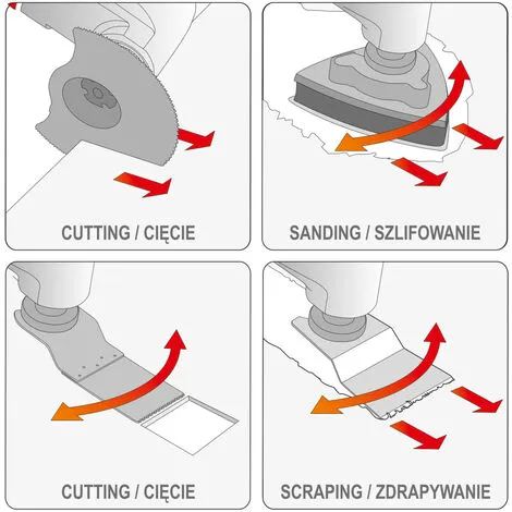 Avec cet outil polyvalent pratique, le sciage, le ponçage et le grattage sont effectués facilement et rapidement. Le contrôle électronique de la vitesse assure un démarrage en douceur et permet d’ajuster précisément la puissance à la tâche à accomplir. La poignée souple est antidérapante et confortable à tenir, tandis que la conception extrêmement mince en fait une aide idéale dans les endroits difficiles à atteindre. L’extracteur à poussière et l’adaptateur peuvent être montés sans outils pour garder l’air propre à tout moment, même sur les travaux poussiéreux. L’ensemble d’outils peut couper des panneaux de meubles, des portes ajourées, des panneaux découpés et des plinthes sans obstruer le stratifié et les pièces métalliques comme les clous, les vis, etc.