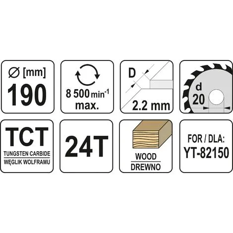 Lame de scie circulaire YATO à 24 dents. La lame de scie circulaire a une circonférence de 190 mm et un diamètre intérieur de 20 mm. La lame de scie circulaire est destinée à une scie circulaire.